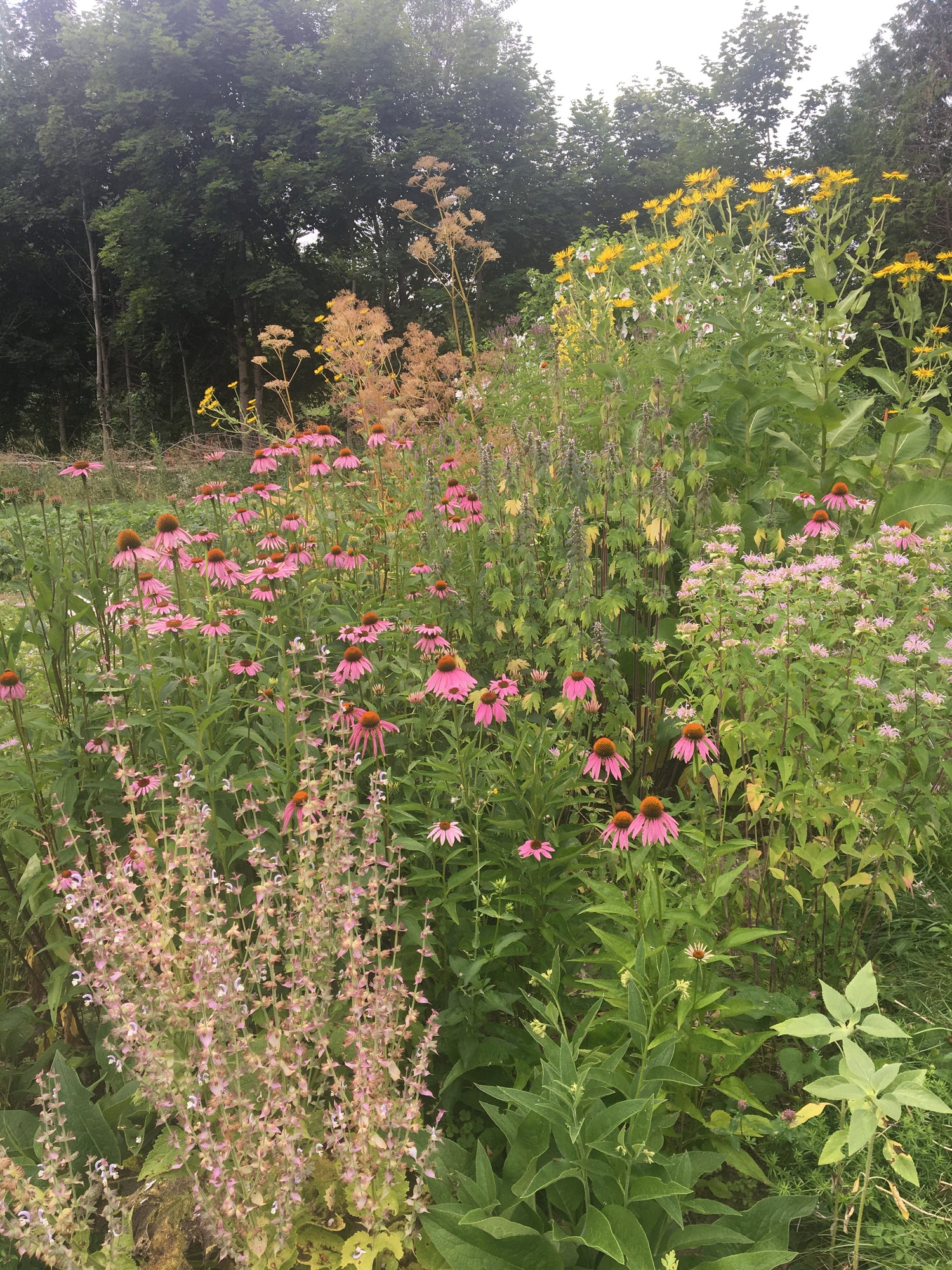 Located within the Coastal Volcanic Belt three miles from the Gulf of Maine, perched in the rolling hills of the wide, U-shaped Narraguagus River Valley, our garden grove’s foundation of health was created ten thousand years ago as the receding glaciers left behind rich deposits of rock, sand, silt, and clay. Rebirthed in the Spring of 2020, the garden is a hand-cultivated experience slowly being forged into the existing fabric of native plant ascensions and forest trees. Fed by upland waters nestled within the rocks of wild blueberry barrens, the garden receives mineral rich, forest filtered, gravity fed spring water that saturates the hillsides upon which it grows, creating the opportunity for an emerging network of vegetables, fruit trees, herbs, medicinal plants, fungi, and humans to take root and thrive.
